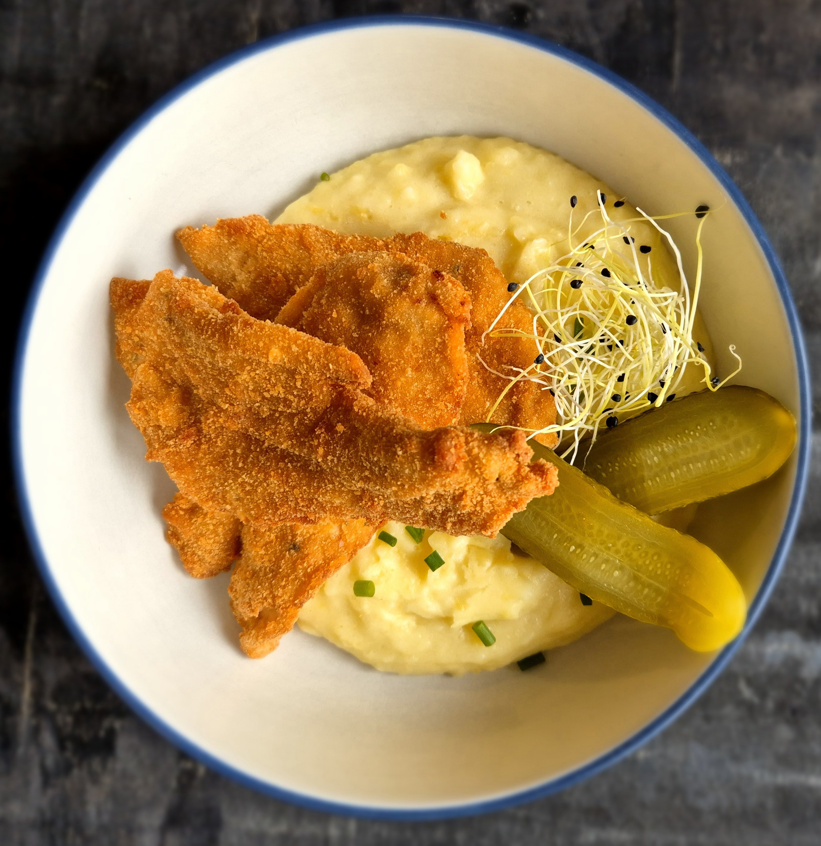5. Vyprážaný karfiol, šťúchané zemiaky, domáca tatárska omáčka