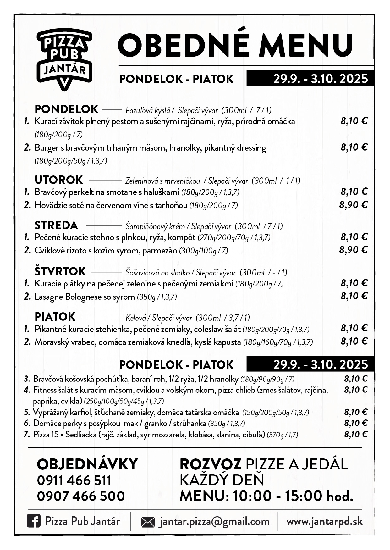 Jedálny lístokOBEDOVÉ MENU 29.09.2025 - 03.10.2025
