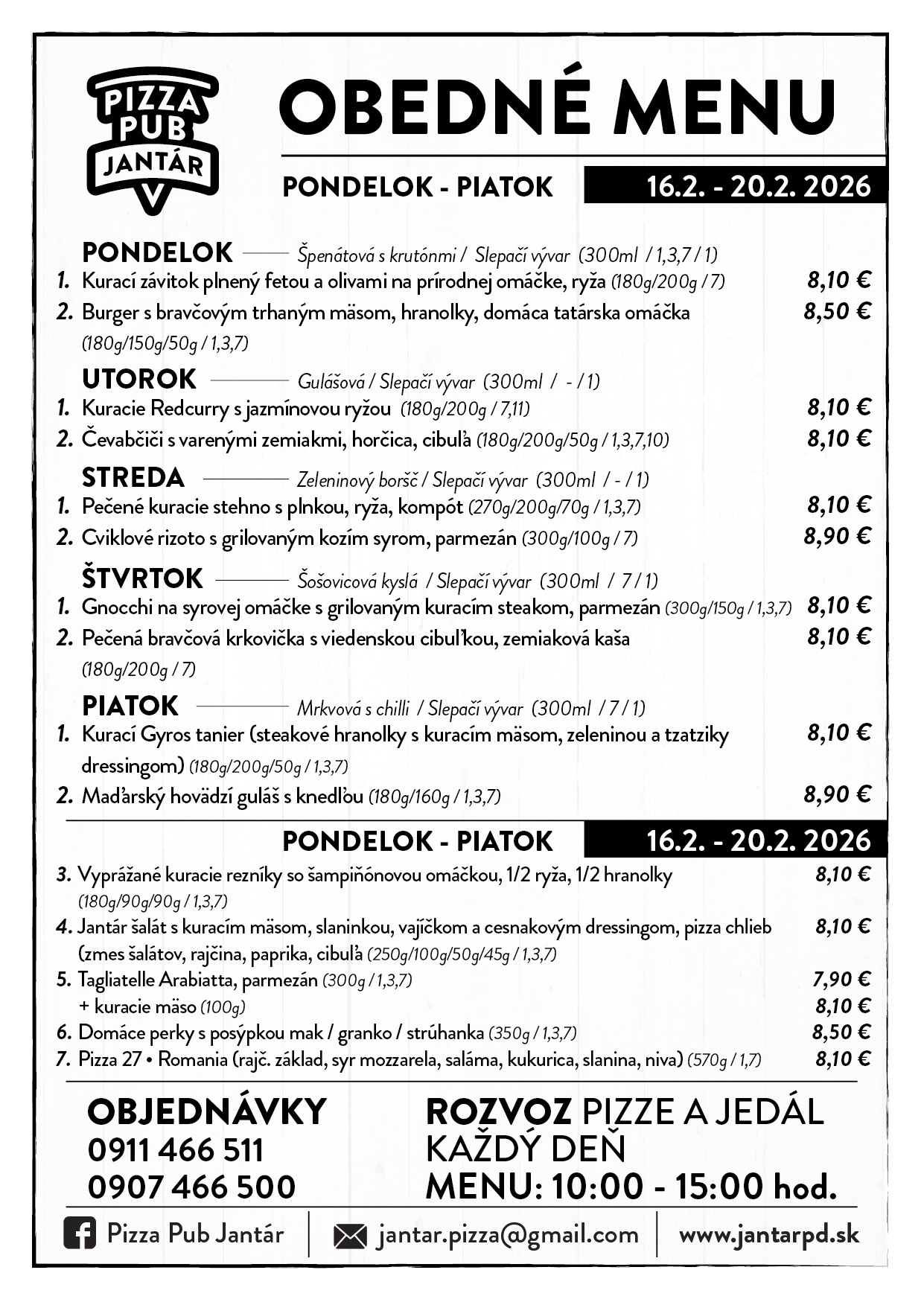 Jedálny lístokOBEDOVÉ MENU 16.02.2026 - 20.02.2026