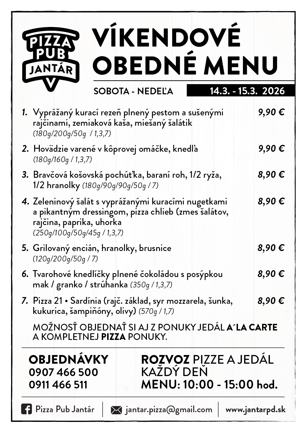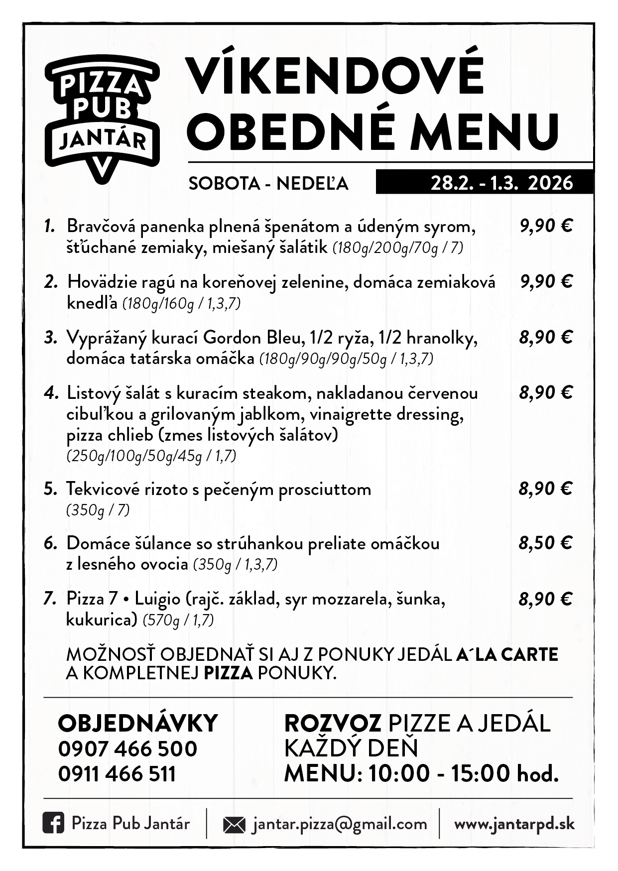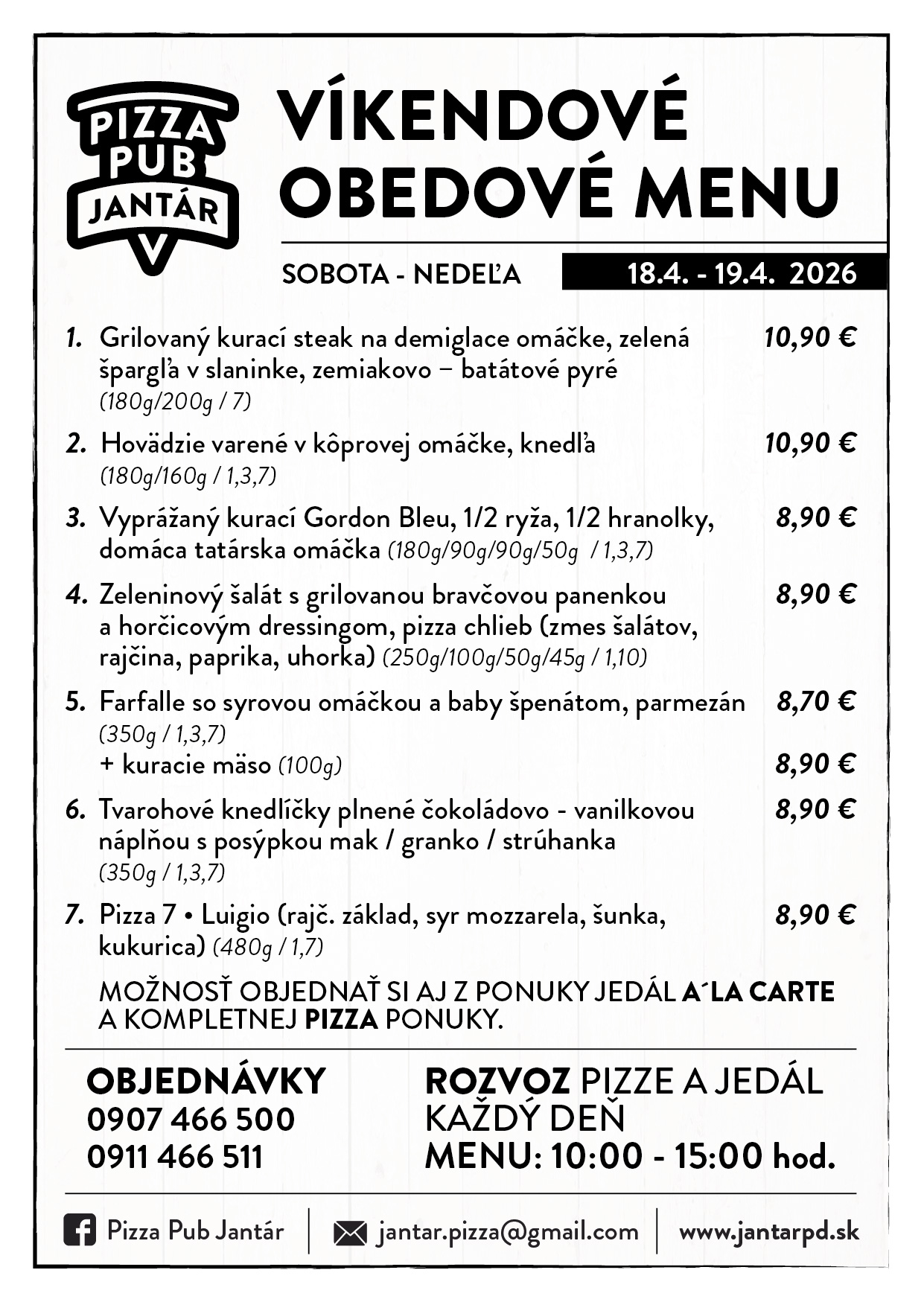 ►OBJEDNÁVKY PRIJÍMAME KAŽDÝ DEŇ OD 9:00 ►VÝBER JEDÁL Z À LA CARTE JE MOŽNÝ - PIATOK 15:00-20:00, SOBOTA 10:30-20.00, NEDEĽA 10:30-15:00