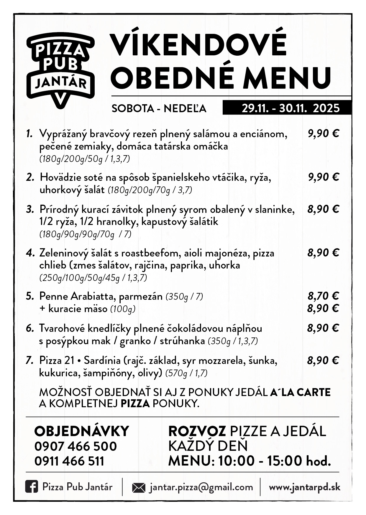►OBJEDNÁVKY PRIJÍMAME KAŽDÝ DEŇ OD 9:00 ►VÝBER JEDÁL Z À LA CARTE JE MOŽNÝ - PIATOK 15:00-20:00, SOBOTA 10:30-20.00, NEDEĽA 10:30-15:00