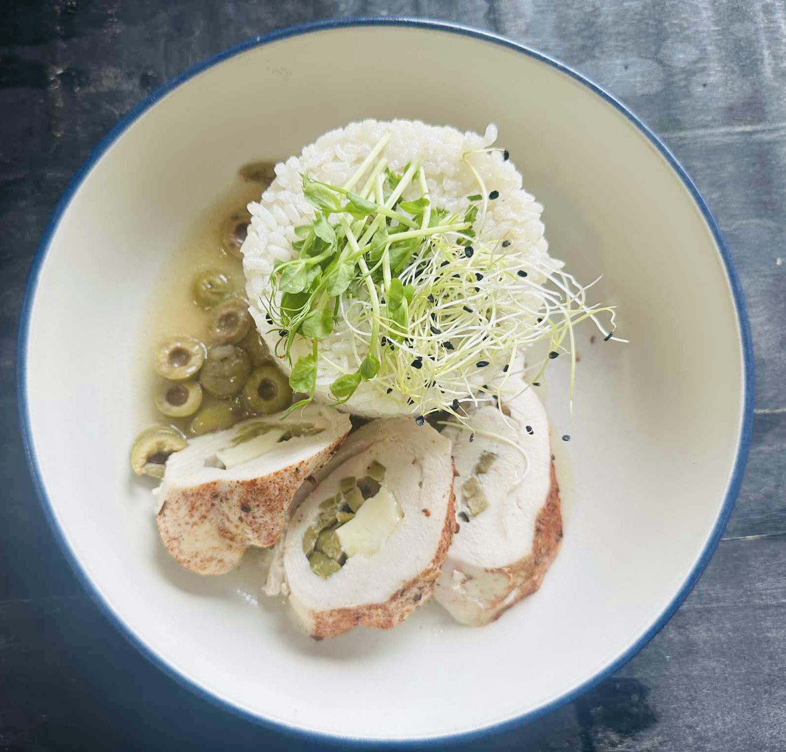 1. Kurací závitok plnený fetou a olivami na prírodnej omáčke, ryža